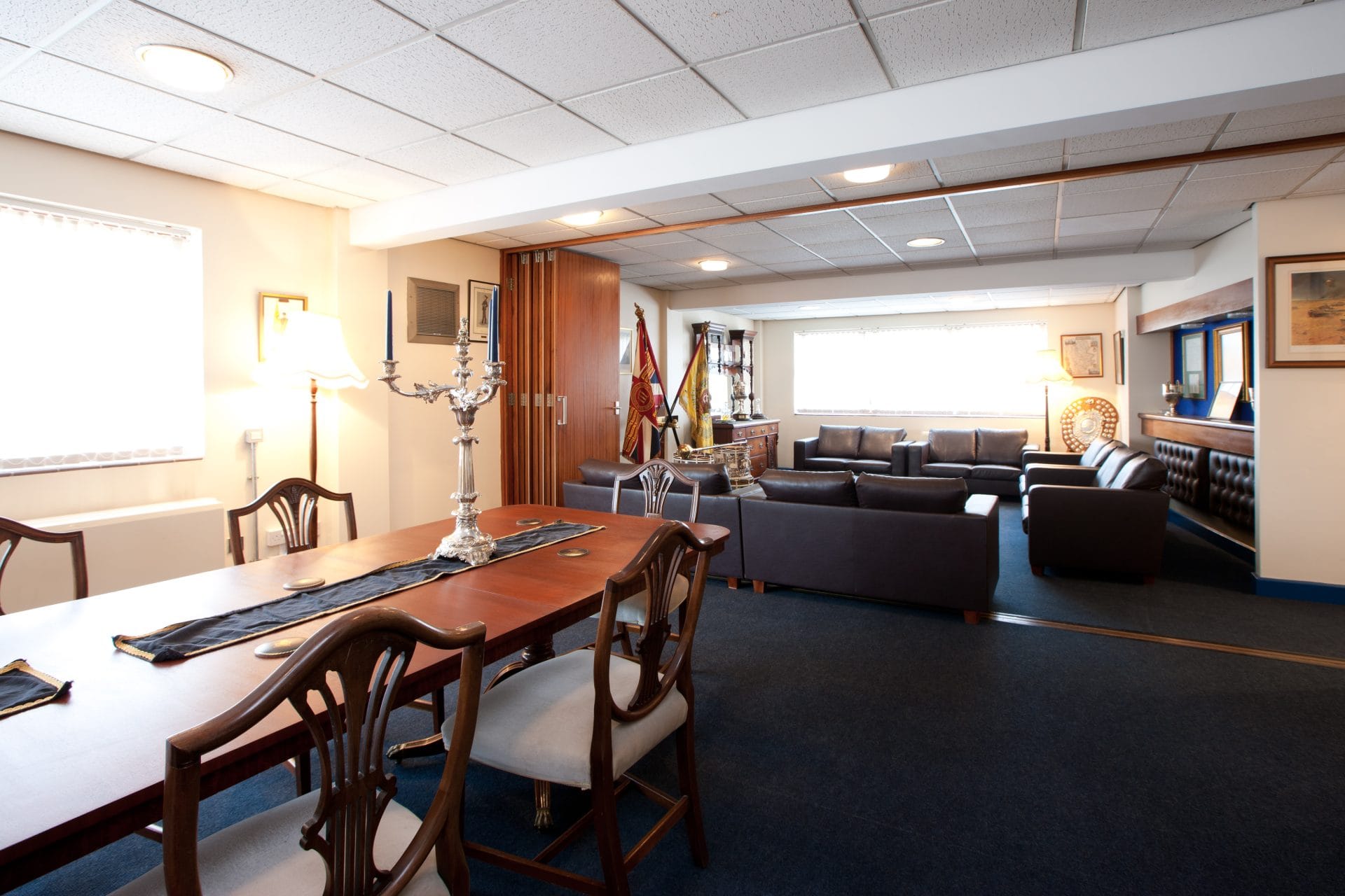This room has seating for 11 and tables for 6 alongside a double seated sofa. The rooms offers additional flexibility with a folding partition.
