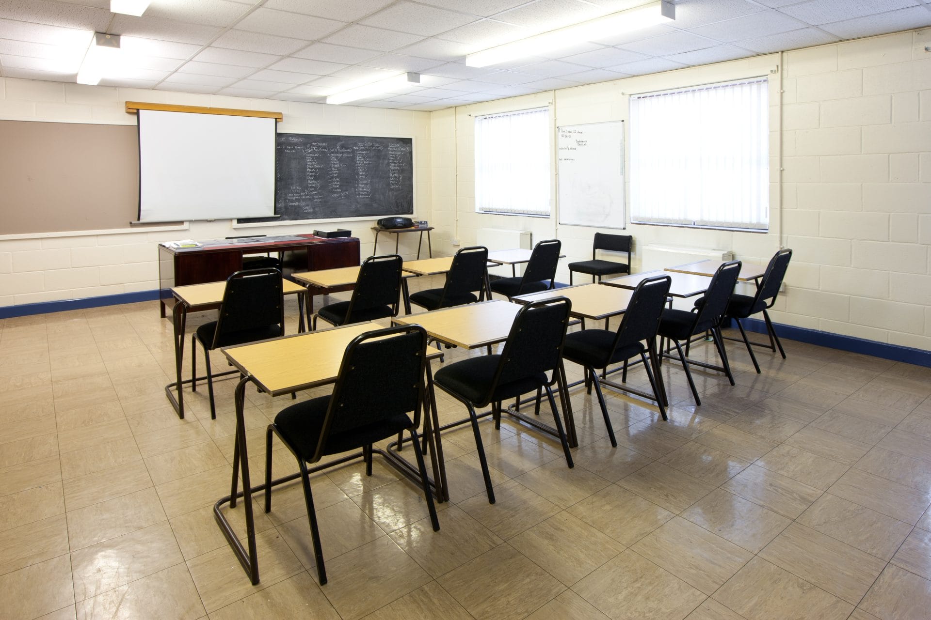This classroom can seat 8 people at individual tables with a fitted Promethean screen and sound bar.