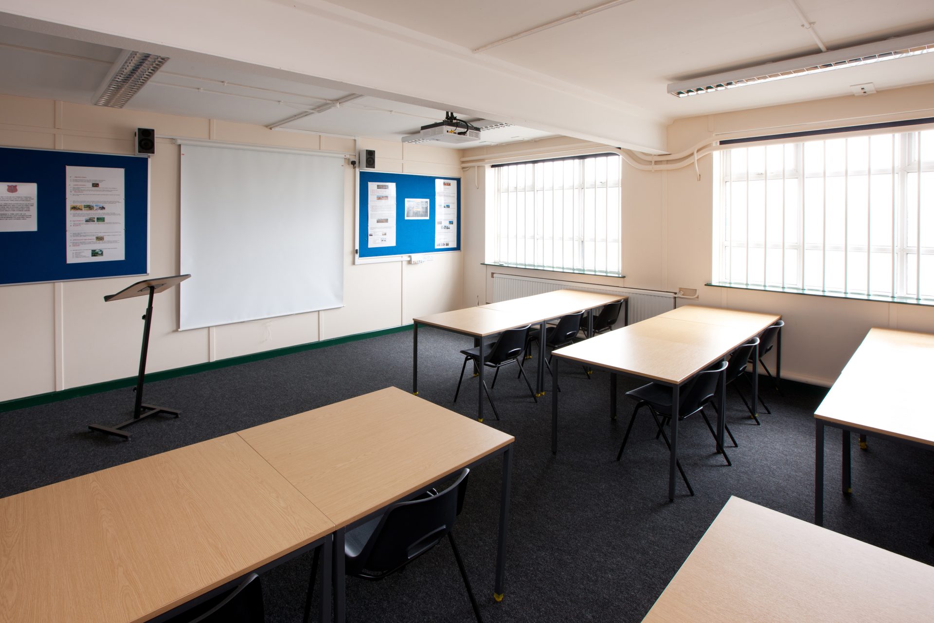 This classroom can seat 18 people in three rows of six with a fixed screen and projector.